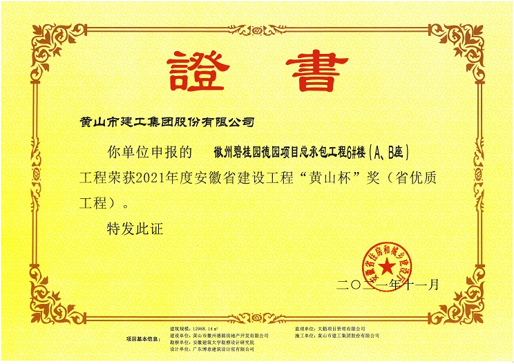 由黃山建工集團(tuán)承建的徽州區(qū)碧桂園德園項(xiàng)目總承包工程6#樓(A、B座) 工程榮獲安徽省工程質(zhì)量最高獎(jiǎng)“黃山杯”獎(jiǎng)。該工程在開工伊始,項(xiàng)目部就制訂了創(chuàng)優(yōu)目標(biāo),嚴(yán)格過程控制,建立健全項(xiàng)目質(zhì)量管理體系,狠抓現(xiàn)場(chǎng)施工管理,把好施工過程質(zhì)量控制關(guān),為創(chuàng)精品工程打下堅(jiān)實(shí)的基礎(chǔ)。