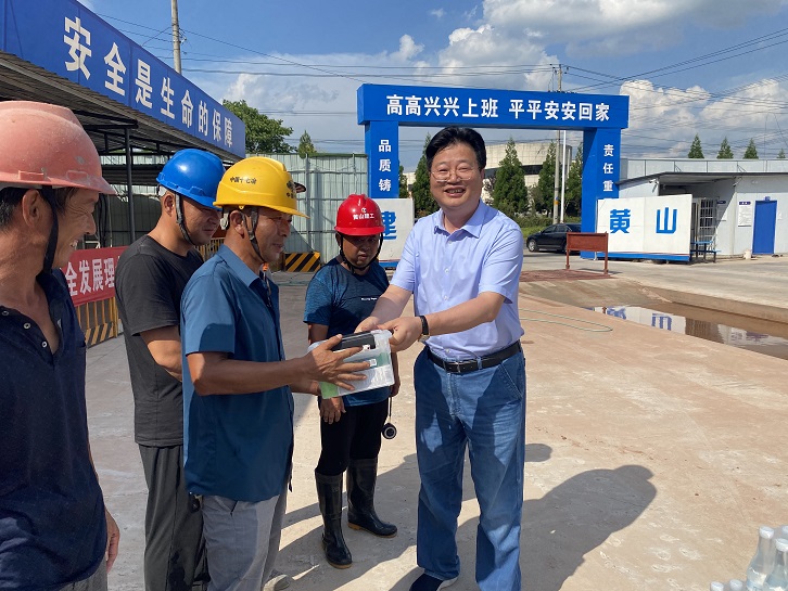 在黃山市南部城鎮(zhèn)群水務(wù)調(diào)度中心項(xiàng)目、黃山生豬定點(diǎn)屠宰加工及配套設(shè)施項(xiàng)目及配套冷鏈項(xiàng)目施工現(xiàn)場,城投集團(tuán)總裁黃世穩(wěn)、黨委副書記汪蓉、副總裁朱愛民等一行將慰問品送到一線職工手中,并和大家親切交談,細(xì)致了解大家的生活工作情況,總裁黃世穩(wěn)叮囑要注意勞逸結(jié)合,合理安排作息時(shí)間,做好防暑降溫工作,確保實(shí)現(xiàn)安全生產(chǎn)。