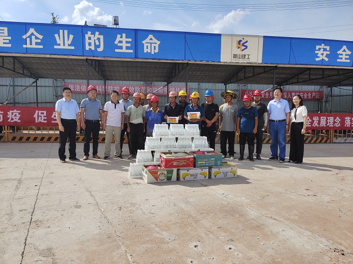 7月21上午,業(yè)主單位黃山市城投集團(tuán)黨委書記、董事長陳杰、總裁黃世穩(wěn)等一行分組帶隊(duì)到我公司承建的黃山市危險(xiǎn)(含醫(yī)療)廢物集中處置中心易地重建工程、黃山市南部城鎮(zhèn)群水務(wù)調(diào)度中心項(xiàng)目、黃山生豬定點(diǎn)屠宰加工及配套設(shè)施項(xiàng)目及配套冷鏈項(xiàng)目施工現(xiàn)場送來了人丹、十滴水、礦泉水、西瓜等防暑降溫用品,并向奮戰(zhàn)在一線的施工人員及項(xiàng)目部管理人員表示了親切的慰問和感謝,對(duì)一線人員頭頂烈日不畏酷暑的精神給予了贊揚(yáng)。