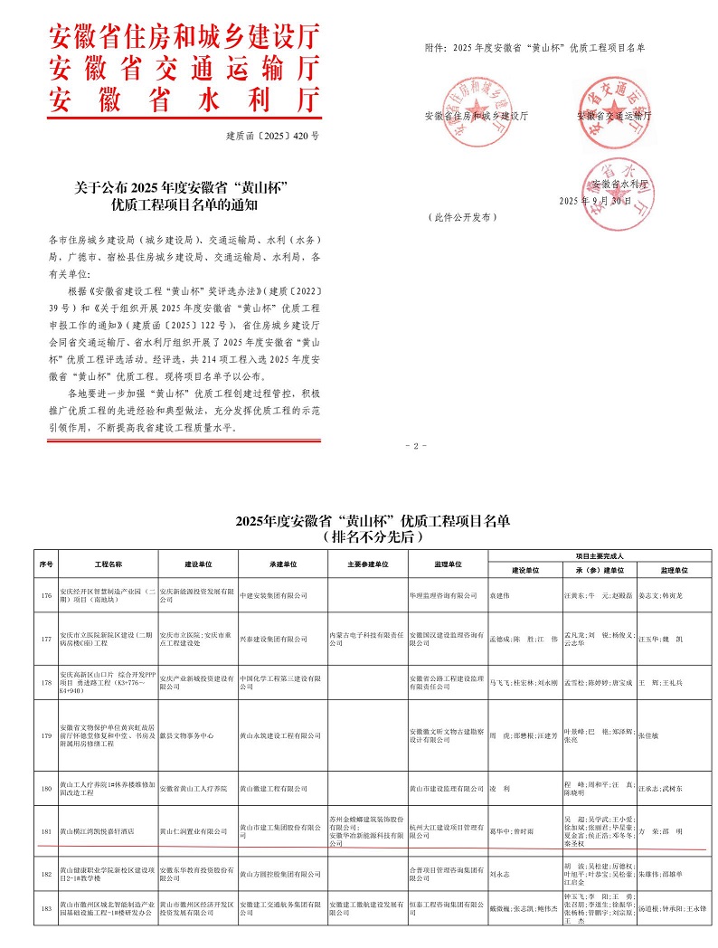 近日,安徽省住房和城鄉(xiāng)建設廳、安徽省交通運輸廳、安徽省水利廳聯合公布了2025年度省“黃山杯”優(yōu)質工程項目名單,黃山市建工集團承建的黃山橫江灣凱悅嘉軒酒店項目成功入選,榮膺安徽省建設工程質量最高榮譽——“黃山杯”獎。